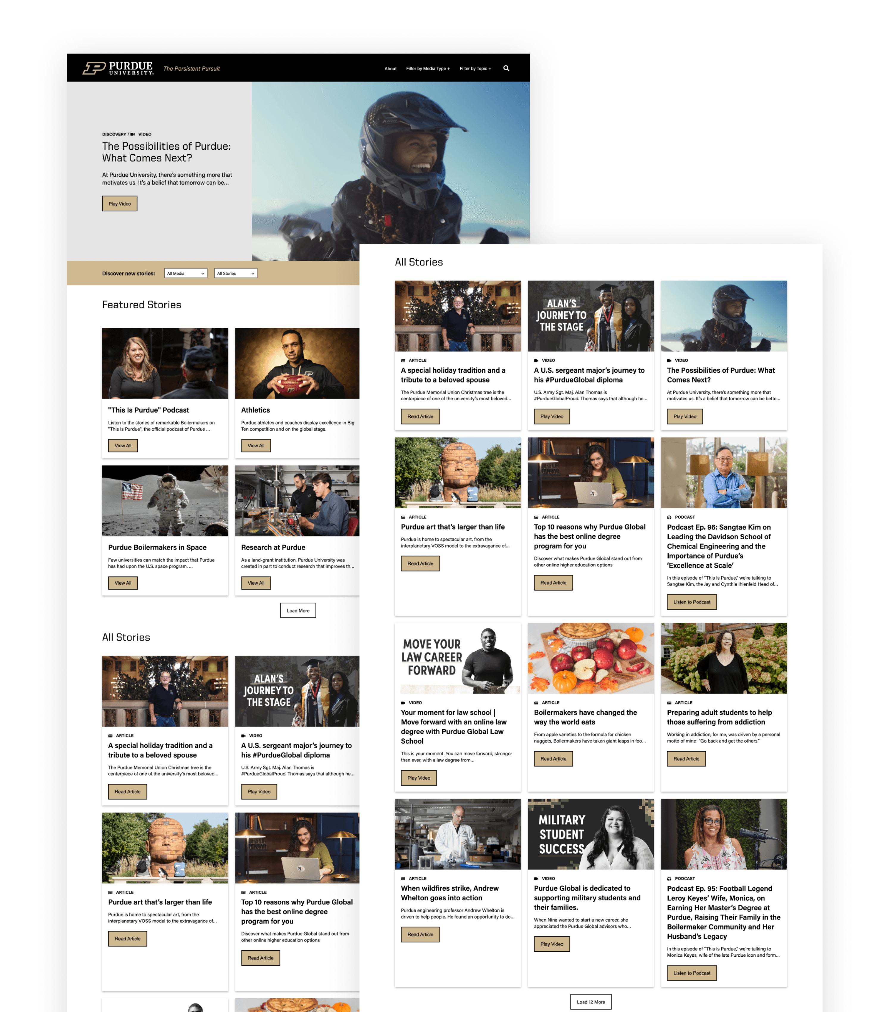 I partnered with the Purdue team to redesign stories.purdue.edu. The goals were to brighten up the design, make the site easier to navigate and stories more discoverable. I introduced a filter bar, allowing users to explore stories by media type or topic.