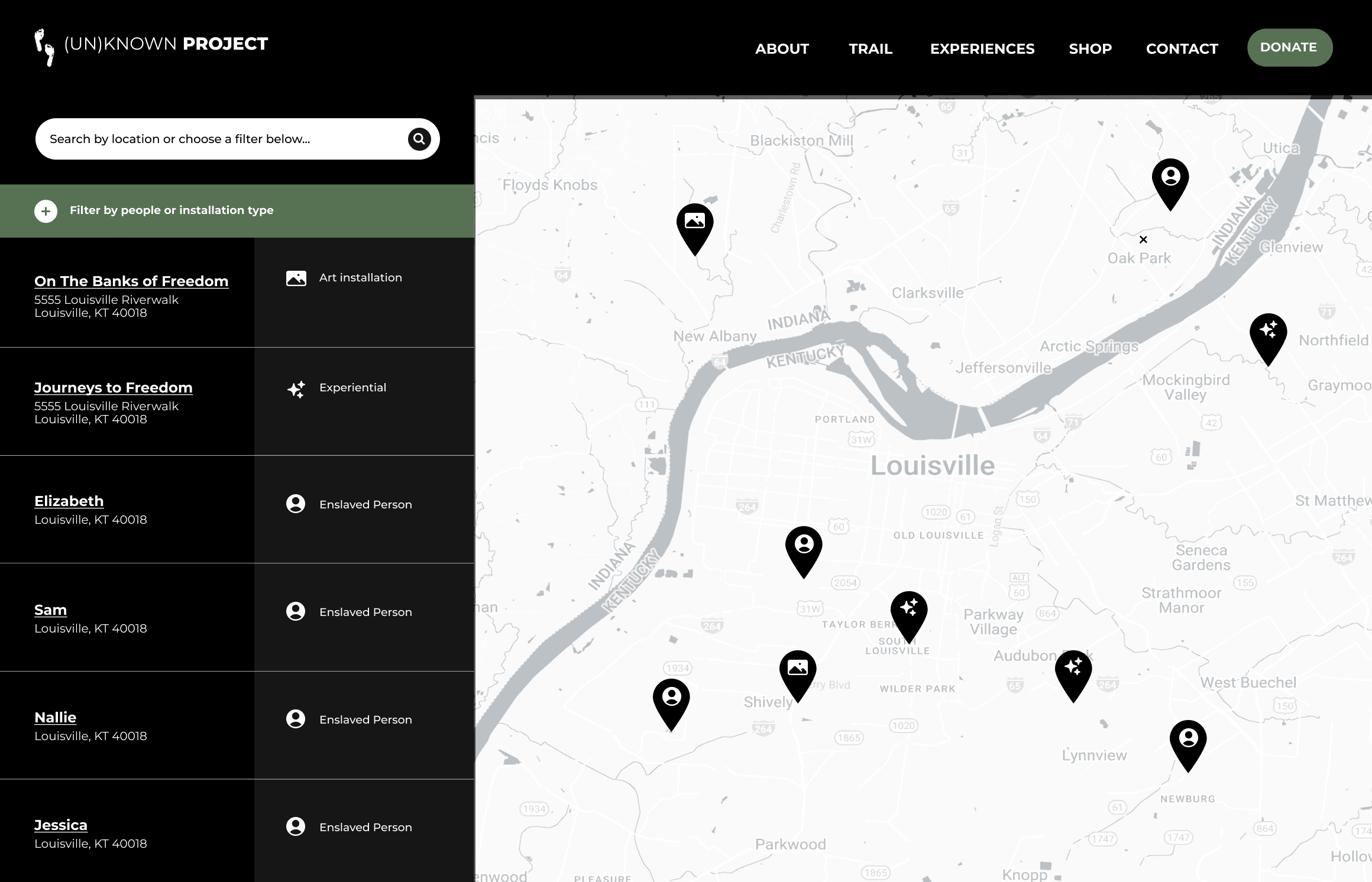 I designed an interactive map experience that helps site visitors find priorly unknown, enslaved persons, art installations and experimental exhibitions that the (Un)Known project has created.
