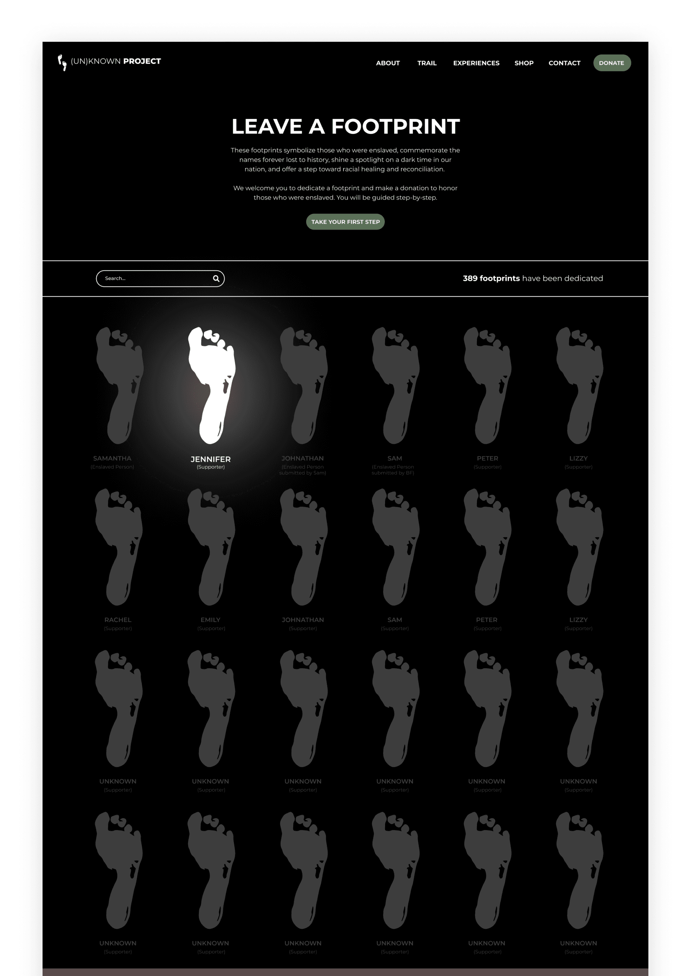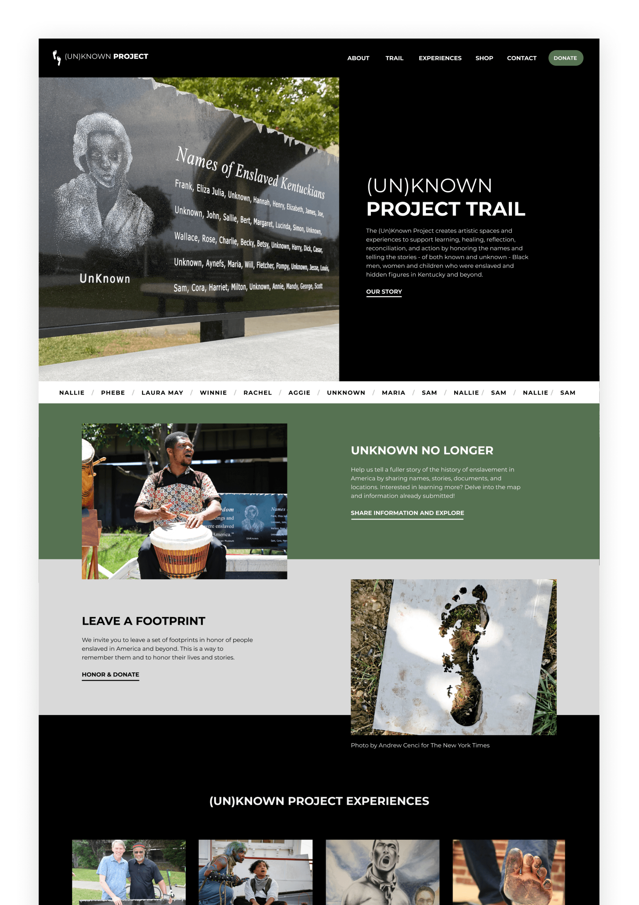 I led the design of the (Un)Known Project's website and established a new color palette, typography and iconography. I came up with the scrolling name bar on the homepage, as a way to further raise awareness for those that were unknown.